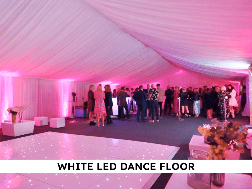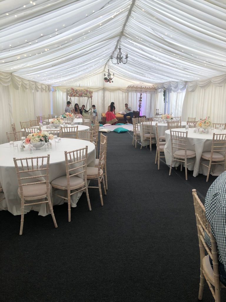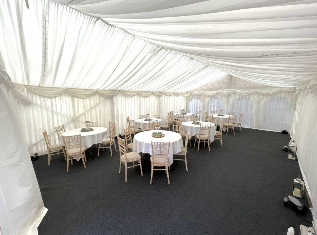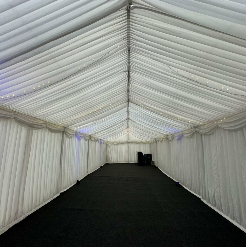 Carpet, Hard Flooring System laid to ground conditions and Pleated White Marquee Lining included in above marquee price