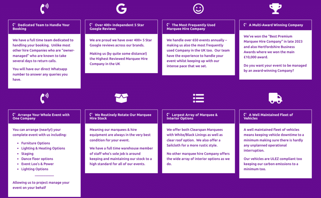 “We used this company for our wedding reception after googling for a marquee hire company. What a great find! Everyone we dealt with, from the people in the office to the guys who ultimately put up/took down the marquee were amazing. The advice given as to size, what we wanted by way of extras (tables, chairs, lights etc etc) and location was invaluable.